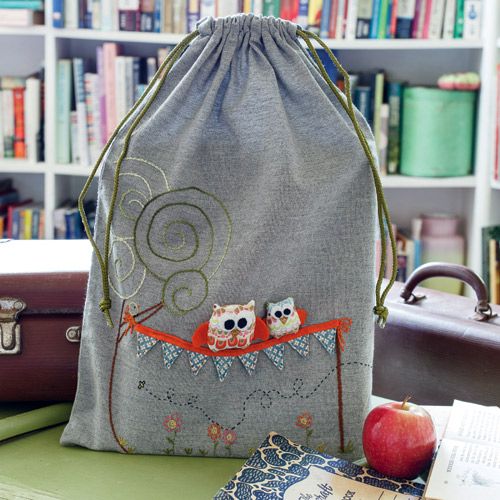 Owl read it to you library bag: Any child will love a trip to the library with this super-cute embroidered owl drawstring library bag pattern from Cosy Project, with two soft owls sitting atop some bunting with embroidered flowers, tree and bee buzzing past. You can buy this pattern by clicking here: Owl read it to you library bag